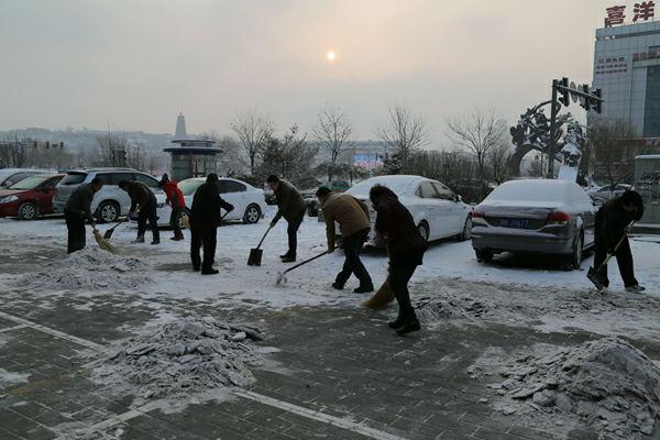 春節(jié)收假后的第一天,集團(tuán)公司辦公室第一時(shí)間通知機(jī)關(guān)各部室人員,清掃主樓站前廣場(chǎng)積雪,各部室積極響應(yīng)。大家不畏嚴(yán)寒,揮舞著鐵鍬掃帚,清掃廣場(chǎng)及通道的積雪。