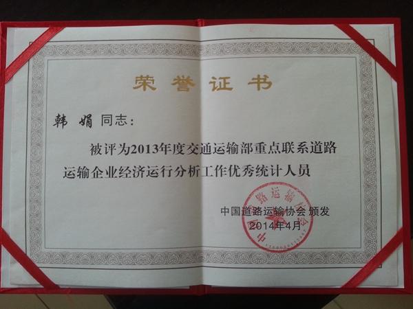 財務部韓娟同志獲得優(yōu)秀統(tǒng)計人員稱號