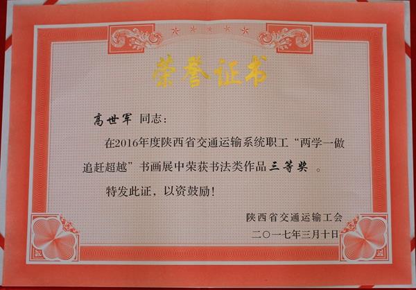 2017年年初由陜西省交通運(yùn)輸廳主辦、省交通運(yùn)輸工會(huì)承辦、省路韻書畫協(xié)會(huì)協(xié)辦關(guān)于以“兩學(xué)一做 追趕超越”為主題的陜西省交通運(yùn)輸系統(tǒng)職工書畫攝影作品展在省交通運(yùn)輸工會(huì)成功舉辦。集團(tuán)公司黨委、工會(huì)對(duì)此次書畫攝影展高度重視,及時(shí)向各基層工會(huì)征集作品并號(hào)召有相關(guān)特長(zhǎng)的職工積極參加此次作品展。