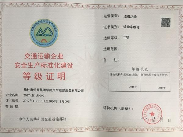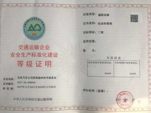 日前,陜西省交通廳發(fā)出“關(guān)于交通運輸企業(yè)安全生產(chǎn)標準化二、三級達標企業(yè)的通知”,根據(jù)《交通運輸企業(yè)安全生產(chǎn)標準化建設(shè)評價管理辦法》、《交通運輸企業(yè)安全生產(chǎn)標準化達標考評指標》要求,經(jīng)自評、申請、受理、評價、審核、審定等程序,集團公司東風汽車公司陜西榆林技術(shù)服務(wù)站、榆林市恒泰運輸集團綏德汽車維修服務(wù)有限公司兩個修理廠被認定為“交通運輸企業(yè)安全生產(chǎn)標準化二級達標企業(yè)”,現(xiàn)已發(fā)證。 資質(zhì)證書有效期為2017年11月10日至2020年11月09日。此次安全生產(chǎn)標準化二級達標證書的獲得,完善了集團公司安全生產(chǎn)標準化管理體系,推動集團公司安全工作又上了一個新臺階。(圖文 侯勇鵬)