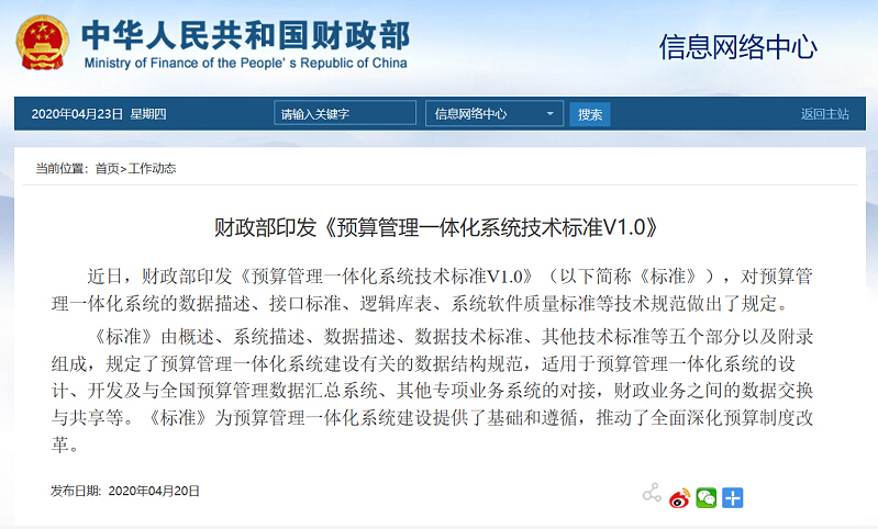 2019年7月,財政部召開財政核心業(yè)務一體化系統(tǒng)建設現場會暨全國財政信息化工作會議,對預算管理一體化系統(tǒng)建設相關工作進行了部署。按照工作部署要求,財政部研究制定了《預算管理一體化規(guī)范》,并在此基礎上,結合軟件工程設計方法,編制了《預算管理一體化系統(tǒng)技術標準》,用友政務專家受邀參加專家組,參與標準規(guī)范的研討和編寫,并獲得財政部表揚信。該規(guī)范構建了全國統(tǒng)一的預算管理數據結構,為預算管理一體化系統(tǒng)建設提供了基礎和遵循。